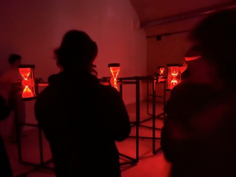 Fruit d’une collaboration entre l’artiste et un laboratoire de neurosciences, l’installation Myriades met en scène le principe de l’imagerie par particules magnétiques (IRM) et s’anime à partir de données physiologiques enregistrées, invisibles à l’œil nu. L’écoulement de grains magnétiques à l’intérieur de cinq sculptures en verre dessine le passage du temps, transformant ainsi le mécanisme de la mémoire en matière tangible.