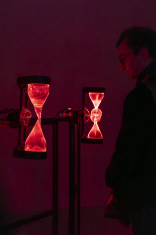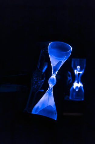 Les sculptures sont réalisées en collaboration avec un verrier scientifique, reprenant le principe du sablier, en multipliant les écoulements de matière entre gravité terrestre et suspension.